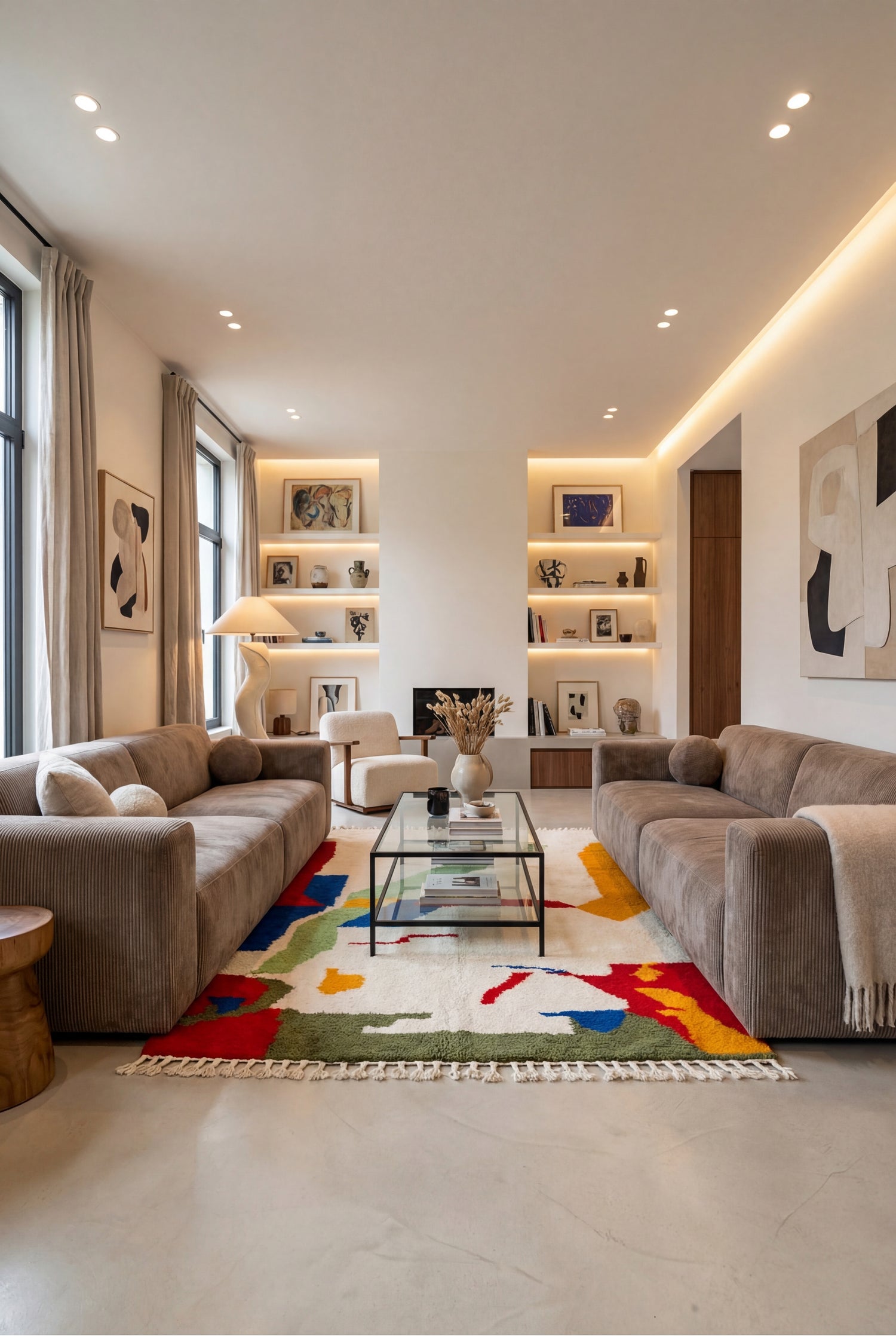 Olohuoneen keskelle, sohvapöydän ja sohvan alle, Tämä on suuren maton viitesijoitus. Maton tulee olla riittävän leveä, jotta sohvan etujalat lepäävät sillä, ja riittävän pitkä ylittääkseen sohvapöydän 20–30 cm. Tämä sijoitus yhdistää visuaalisesti koko olohuoneen tilan – sohvan, nojatuolit, sohvapöydän – yhtenäiseksi kokonaisuudeksi. Azilal-maton kirkkaat värit tuovat energiaa ja luonnetta, jota yksiväriset matot eivät voi tarjota.